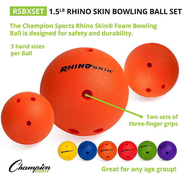 The Champion Sports Rhino Skin Foam Bowling Ball Set is designed for safety and durability. Made with our tough Rhino Skin coating, this 1.5 lb weighted foam bowling ball is great for any age group! This set includes six bowling balls, and each ball is designed with two sets of three-finger grips to accommodate different hand and finger sizes.