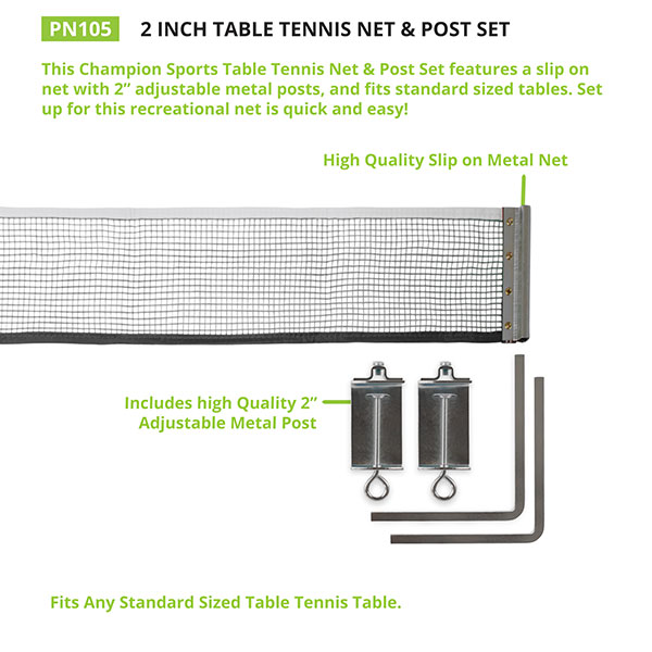 This Champion Sports Table Tennis Net & Post Set features a screw on net with 2? metal posts, and fits standard sized tables. Set up for this recreational net is quick and easy!