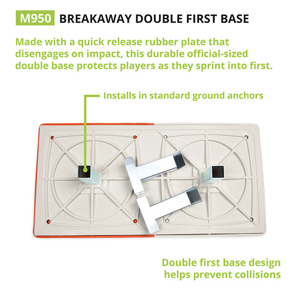 - Quick release double first base disengages from stationary rubber base plate upon impact