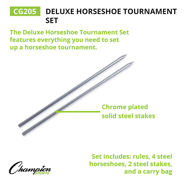 The Champion Sports Deluxe Horseshoe Tournament Set features everything you need to set up a horseshoe tournament, including a set of rules to ensure games stay on track. The tough steel horseshoes are powder coated for an attractive shine and extra durability. The set includes two rugged powder coated steel stakes to aim at. Comes with a carrying bag made from strong 1680 denier nylon fabric and a YKK zipper that can endure toting the sturdy heavy metal pieces around with ease.
