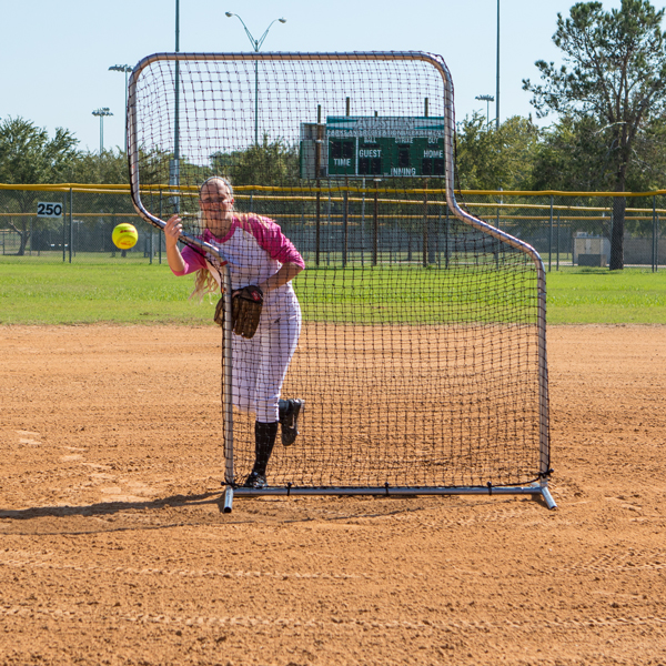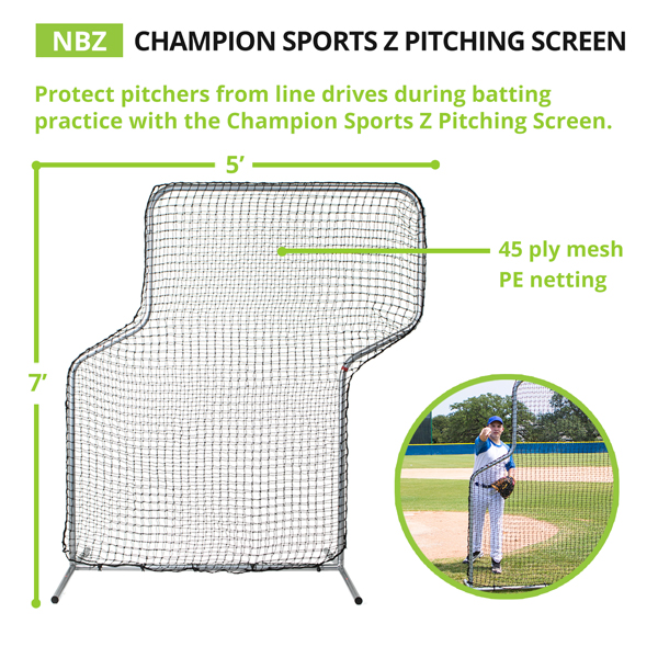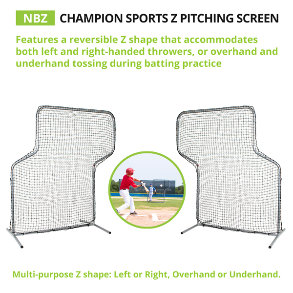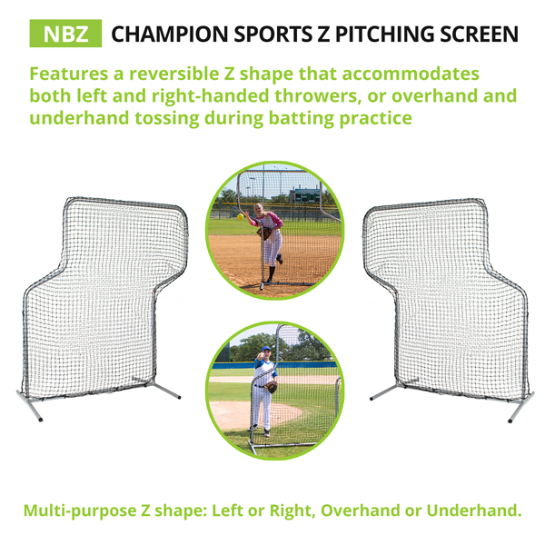 The multi-purpose Champion Sports “Z” Pitching Screen serves as a protective screen for both overhand and underhand throwers on the field. Pitchers and coaches can now safely pitch to batters during practice, without the concern of getting struck by a line-drive. The reversible “Z” shape accommodates both left and right-handed throwers over overhand/underhand tossing. Ideal for baseball and softball batting cage or out on the field. The Z Pitching Screen is constructed of 45-ply mesh PE netting and is 5′ x 7′.