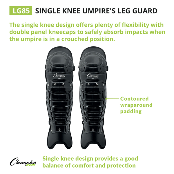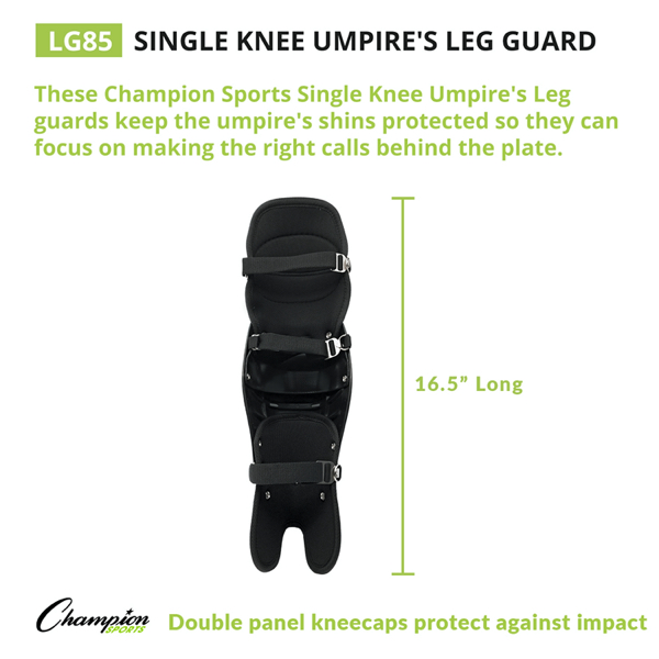 These Champion Sports Single Knee Umpire’s Leg guards keep the umpire’s shins protected from wild pitches so they can focus on making the right calls behind the plate. The single knee design offers plenty of flexibility with double panel kneecaps to safely absorb impacts when the umpire is in a crouched position. The leg guards are designed for maximum movement with contoured wraparound padding for additional comfort and support.