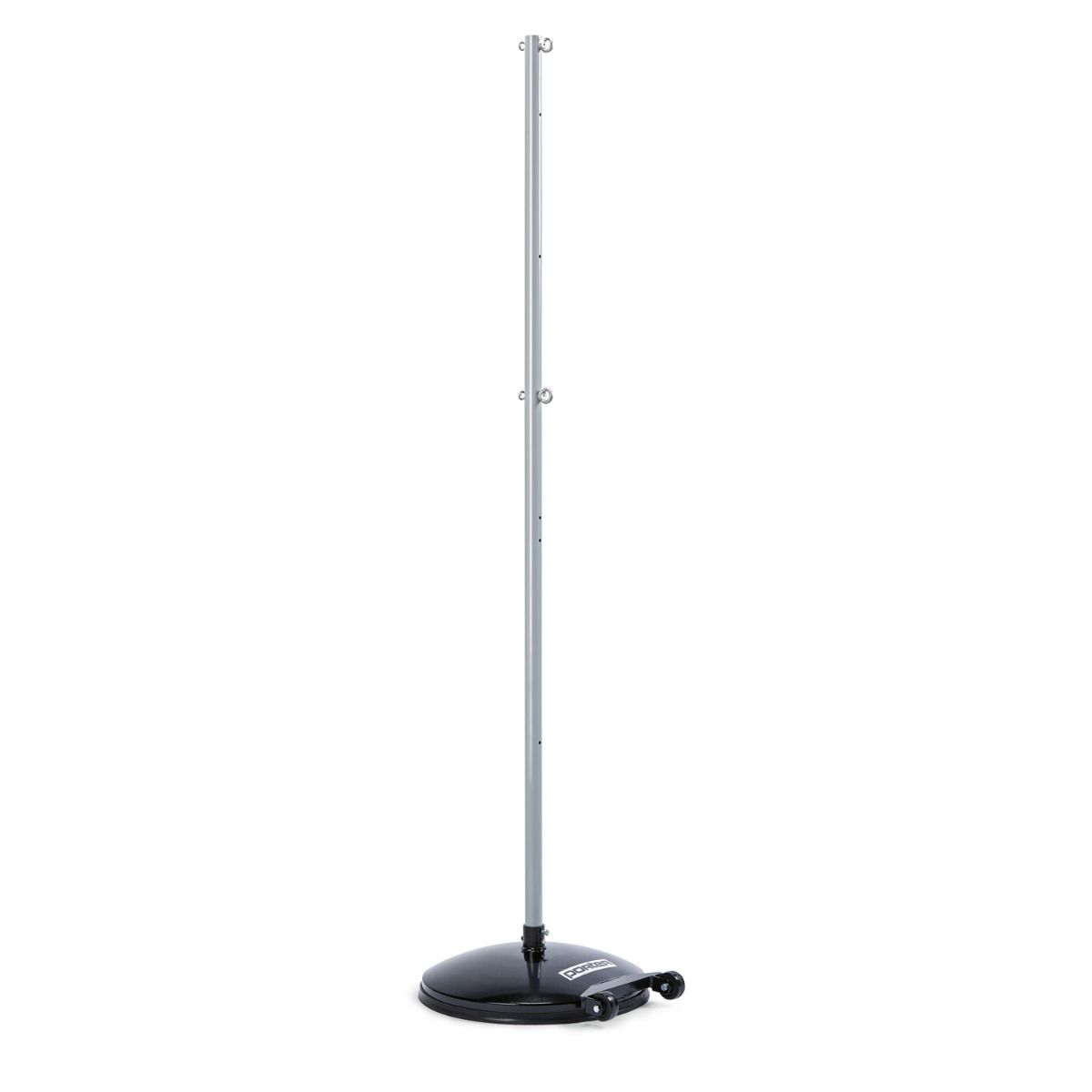 necessary. Powder-coated steel standard is complete with eye bolts and eye nuts. Non-marking rubber protection ring completely encircles 145 lb domed steel base, preventing standard from sliding and floors from being damaged. Base is powder coated gloss black. Frictionless 3? diameter silent-bearing wheels of gray non-marking synthetic provide effortless mobility.