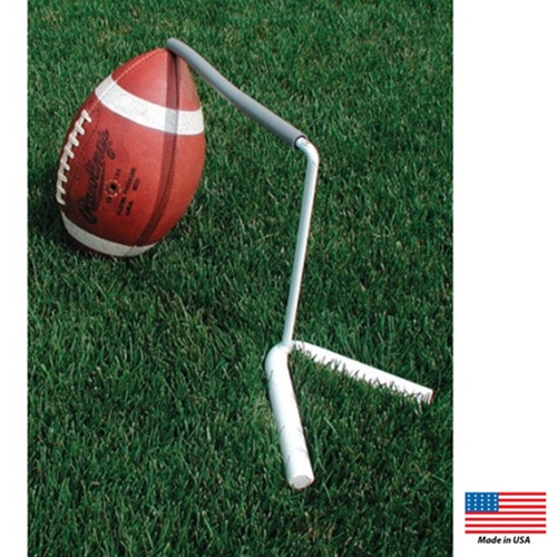 Football kicking holder constructed with heavy enameled steel base with flexible rubber tube to hold tip of football at desired position. Football not included.