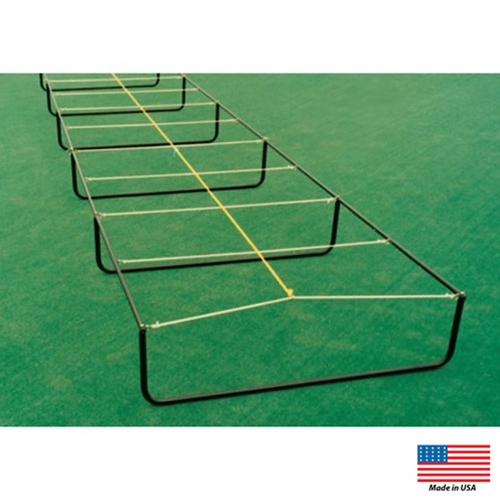 Improves balance and agility. Ideal for all sports at all levels. Constructed of structural steel tubing. Completely portable and collapsible by simply pulling 3 pins. 5’w and up to 40’ long. A 40’ unit stores in an area 16”w x 15’l x 9”h. Zinc plated tubing. Heavy duty shock cord stretches to prevent injury. Available in 16′, 24′, 32′ or 40′ lengths.
